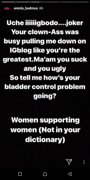 Eniola through her post also hinted that Uche is suffering from bladder control issue. She trolled Uche, calling her ugly and warned her to mind her business henceforth.