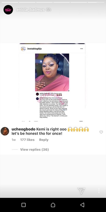 Few weeks after Nollywood Actress, Uche Ogbodo joined Kemi Olunloyo to body-shame Eniola Badmus, via her comments on the concerned post by Instablog9ja.