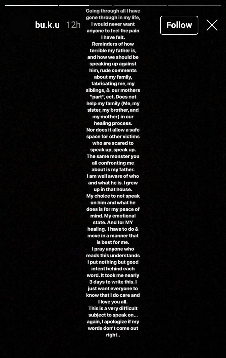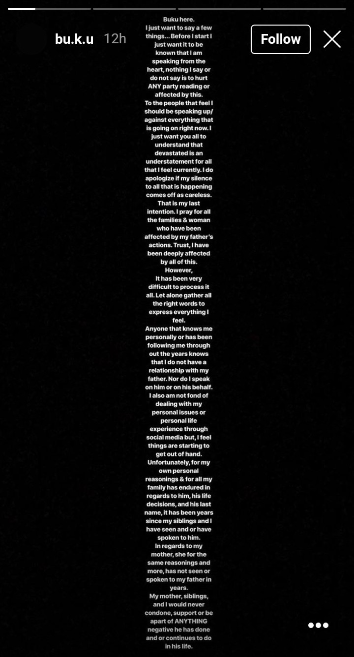 I do apologize if my silence to all that is happening comes off as careless. That is my last intention. I pray for all the families & women who have been affected by my father’s actions. Trust, I have been deeply affected by all of this.