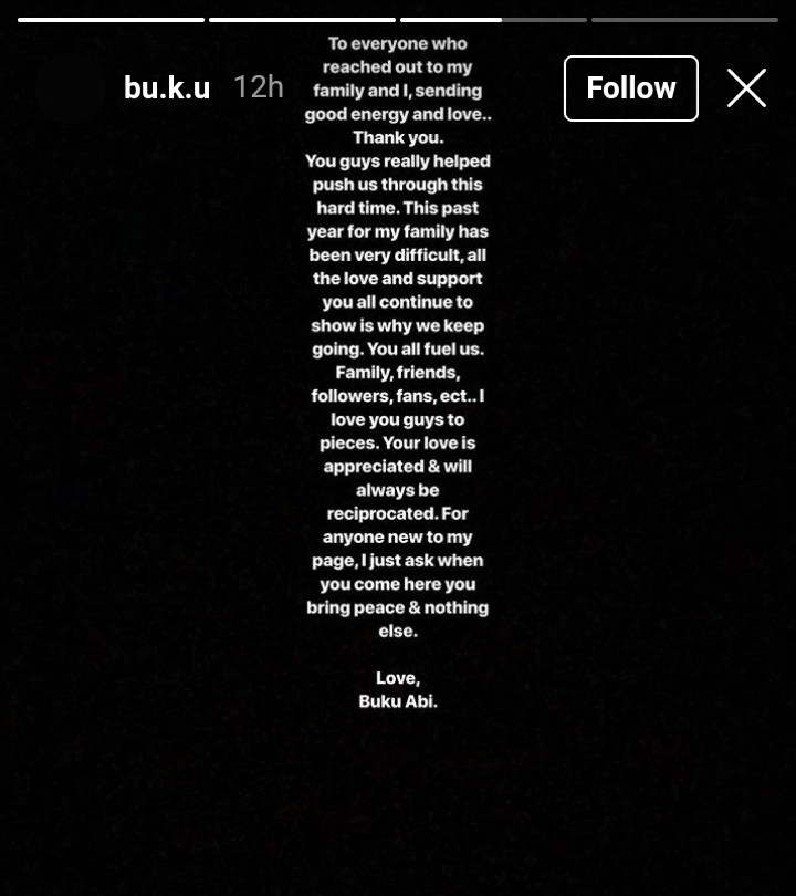 To everyone who reached out to my family and I, sending good energy and love…Thank you. You guys really helped push us through this hard time. This past year for my family has been very difficult, all the love and support you all continue to show is why we keep going. You all fuel us.