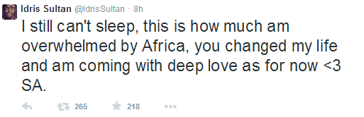 Having been away from social media since July 30, 2014, Idris took to Twitter a few hours ago to thank Africa in his first tweet since he won via his official twitter handle @IdrisSultan saying: ‘I still can’t sleep, this is how much am overwhelmed by Africa, you changed my life and am coming with deep love as for now.’