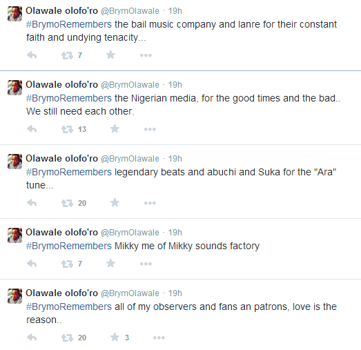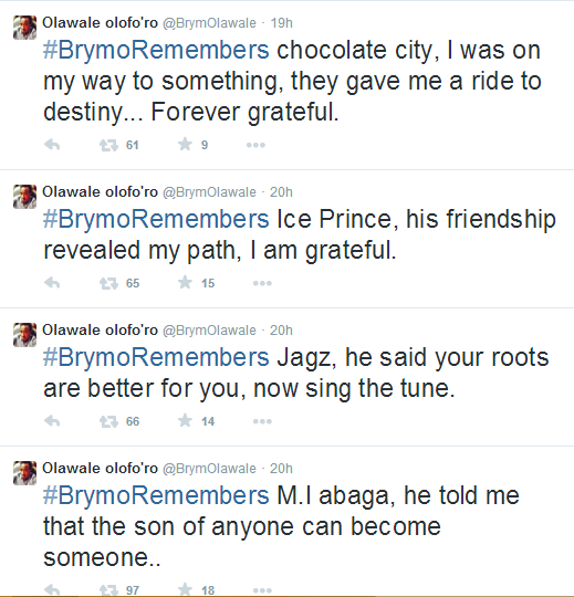 Brymo took to Twitter a few hours ago to remember his early beginning in the music industry and he directed special shout outs in the direction of Chocolate City, Jesse Jags, M.I Abaga,Ice Prince, Denrele Edun and others.
