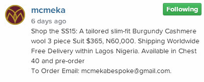However, a quick run through of McMeka’s timeline reveals that Frank Donga’s outfit is one of his new Bespoke creations that retails for $365 (#73,000 if calculated at #200 per dollar).