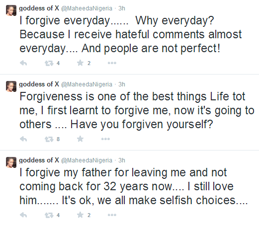 Today, she decided to address the issue in a rather subtle manner, saying the spirit of forgiveness has overtaken her. In a series of tweets, Maheeda says she is forgiving her dad for ditching them all and walking away from his family 32 years ago without looking back.