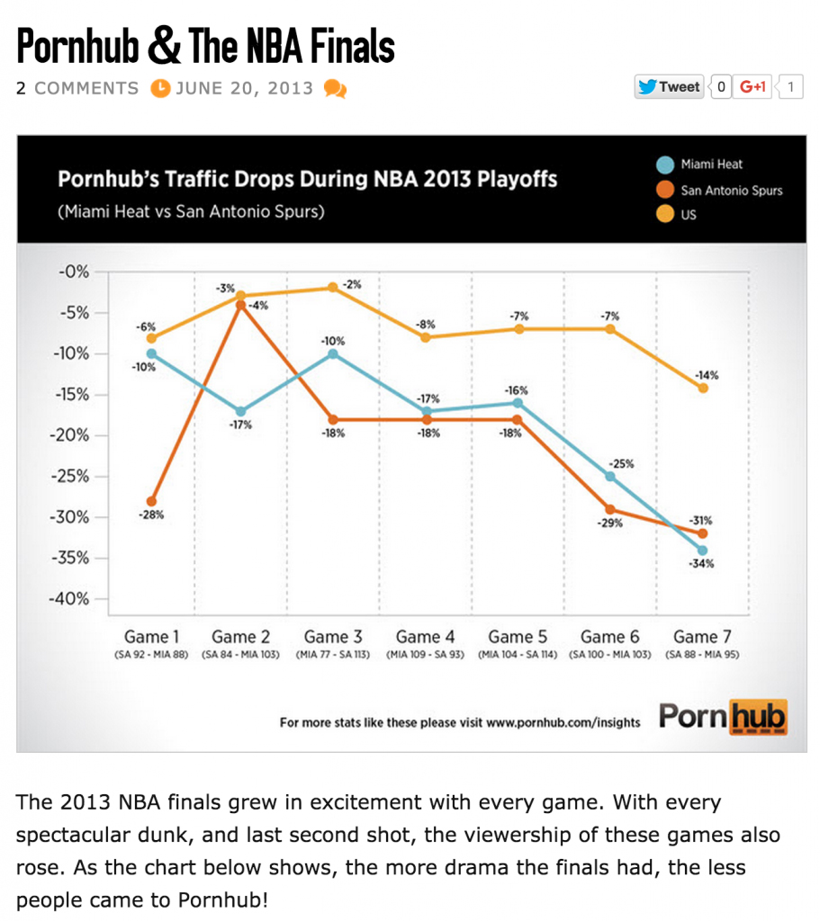 This section, which began with a blog post on June 20, 2013 focused on how the peak points of the NBA Finals caused Pornbub users to leave its the porn site.