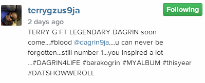Terry G shared a photo of the late Dagrin on his Instagram page with the caption: ‘TERRY G FT LEGENDARY DAGRIN soon come…#blood @dagrin9ja….u can never be forgotten…still number 1…you inspired a lot …#DAGRIN4LIFE #barakogrin #MYALBUM #thisyear’.