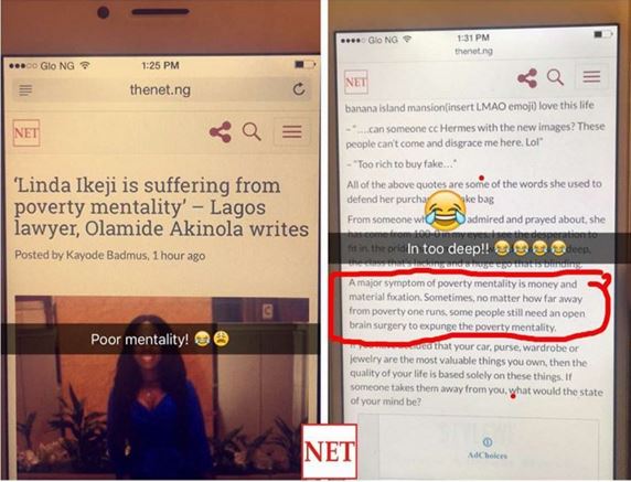 In February 2016, Nigerian singer Wizkid took a shot at popular blogger, Linda Ikeji following the opinion of a Lagos lawyer, Olajide Akinola who wrote on the recent Linda Ikeji Hermes bag drama and described Linda as ‘suffering from poverty mentality’.