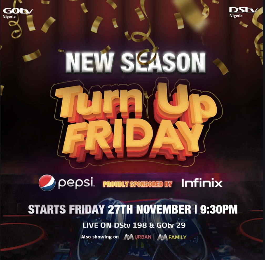 Turn up Friday is a night live music and dance show hosted by The Real Energy Gad, Do2dtun. If you want to chill and have fun in the comfort of your home on Friday night, just buy a bottle of your favourite drink and tune in to Africa Magic DStv 198 at 9:30 pm to join the Turn p Friday party.