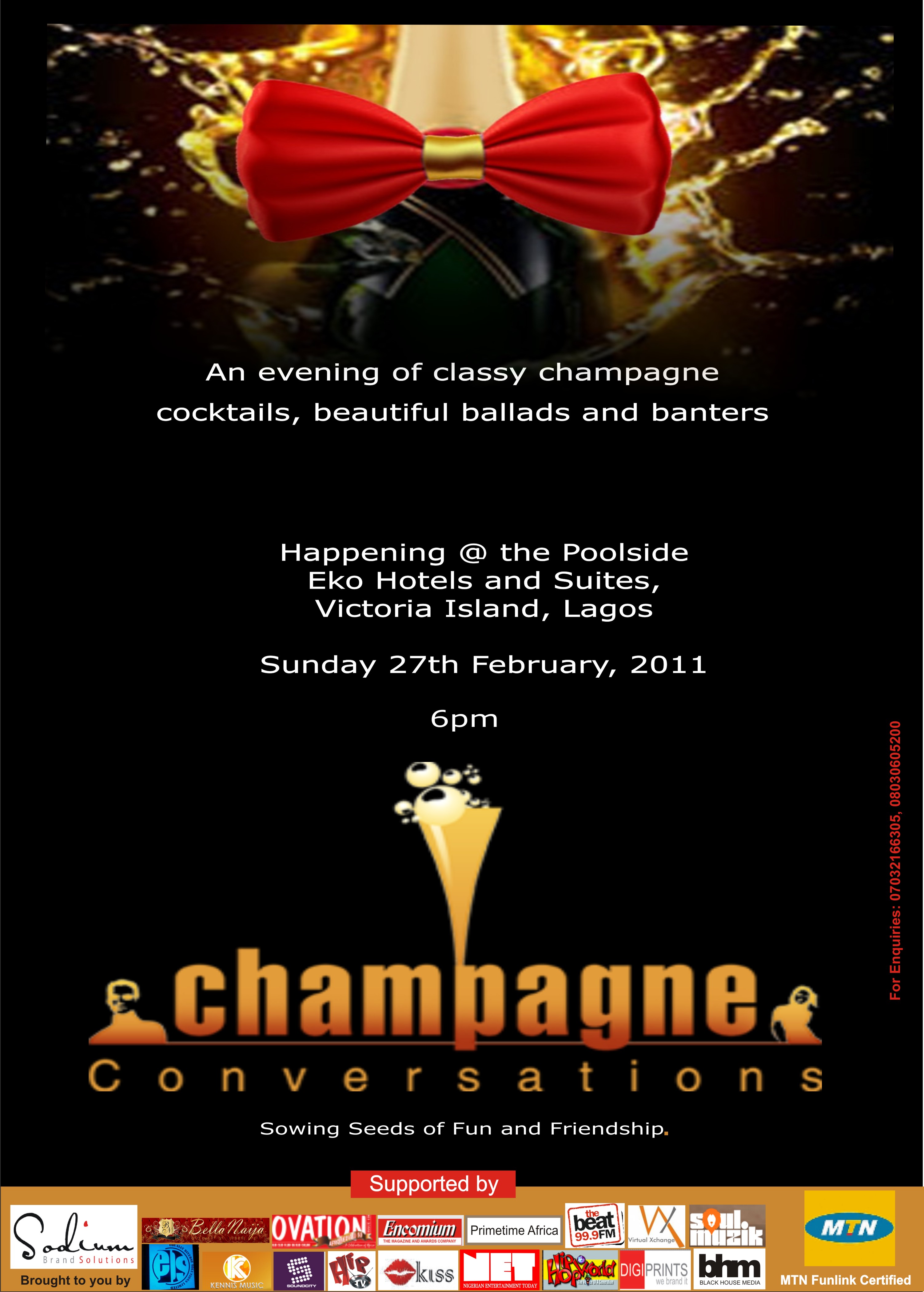 In association with MTN Fun Link, Champagne Conversations is proudly supported by BellaNaija, Encomium Weekly, Ovation International, Nigerian Entertainment Today (NET), BlackHouse Media, DigiPrints, Hip TV, Primetime Entertainment, Soul Muzik, No Surprises Events, KISS Group and Soundcity.
