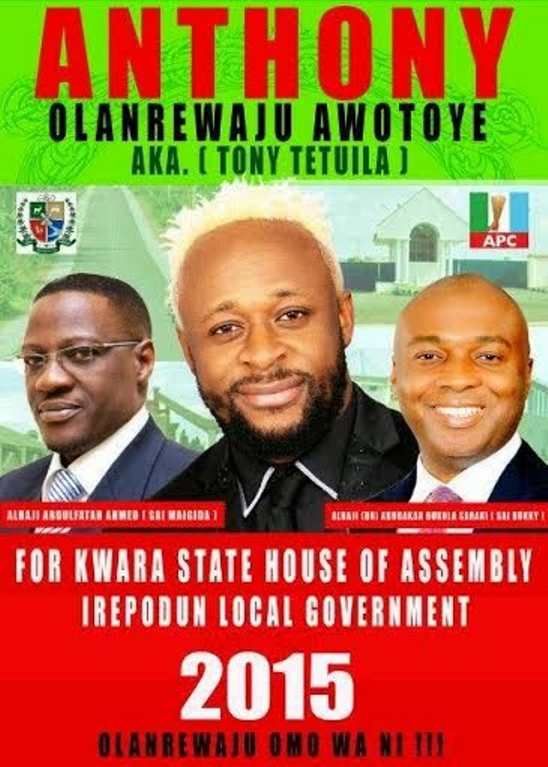 Apart from the criticisms that have poured in as regards Tony Tetuila’s choice of hairdo for his newly-unveiled campaign poster, another fact about the poster that people seem to have ignored is the fact that Tetuila is the only entertainer who has publicly courted political godfathers in the state where they are contesting to the extent of including them in his poster.