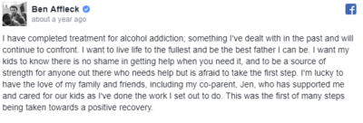 The forty-six-year-old checked into rehab back in 2001 for alcohol abuse, and last year, he wrote a Facebook message praising his estranged wife Jennifer Garner for helping him through rehabilitation.