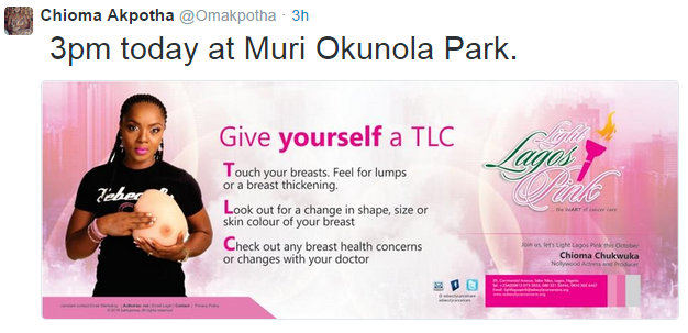 The Bent Arrows actress is billed to speak at a breast cancer awareness campaign at the Muri Okunola Park, Victoria Island Lagos today as part of the Light Lagos Pink initiative.