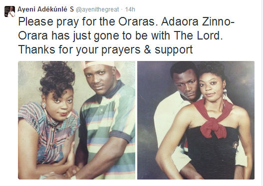 Ayeni Adekunle, BHM CEO, broke the news via Twitter, where he wrote: ‘Please pray for the Oraras. Adaora Zinno-Orara has just gone to be with The Lord. Thanks for your prayers & support.’