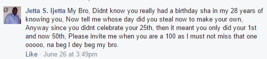 Iro ni Ooo! So @ALIBABAGCFR you will be 50yrs this month? Koje jebe …you don’t look 50 at all! Well, HBD in advance bros. — I’m The Chosen 1 (@JordanOluremi) June 23, 2015