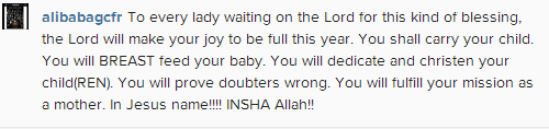 Ali Baba wrote: ‘To every lady waiting on the Lord for this kind of blessing, the Lord will make your joy to be full this year. You shall carry your child. You will BREAST feed your baby. You will dedicate and christen your child(REN). You will prove doubters wrong. You will fulfil your mission as a mother. In Jesus name!!!! INSHA Allah’.