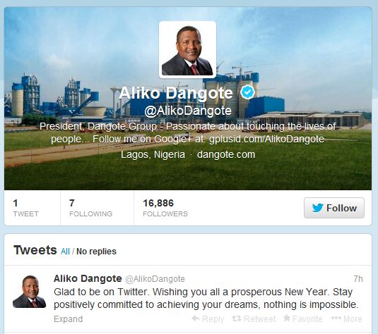 Millions of Nigerians were excited when business tycoon and billionaire Aliko Dangote joined the micro-blogging social network Twitter on December 31, 2013. Twitter went abuzz as Dangote, President of Dangote Group signed up and followed seven people including Bill Gates, Gordon and Sarah Brown and Jack Welch.