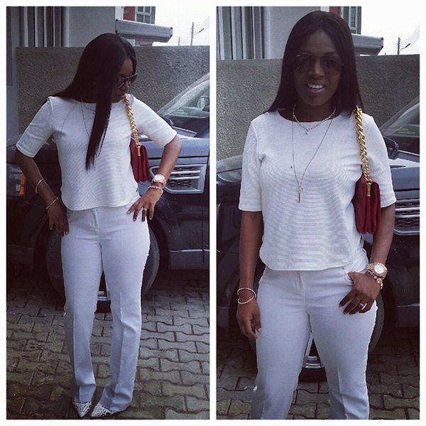 Opting for a white top on a floor-length white pants, Mrs. Idibia finished up the look with white shoes and a red Versace shoulder bag.