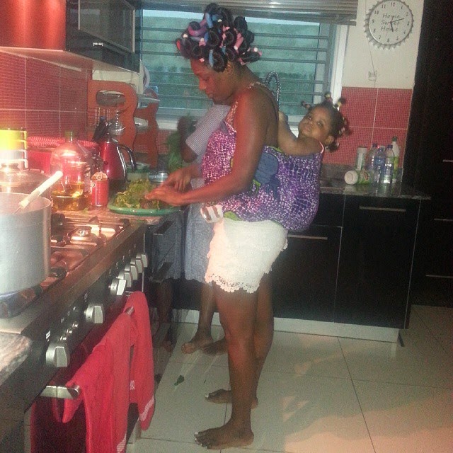 The actress posted a picture of herself barefoot, barefaced and looking busy in the kitchen, with her last child, Olivia, strapped to her back.