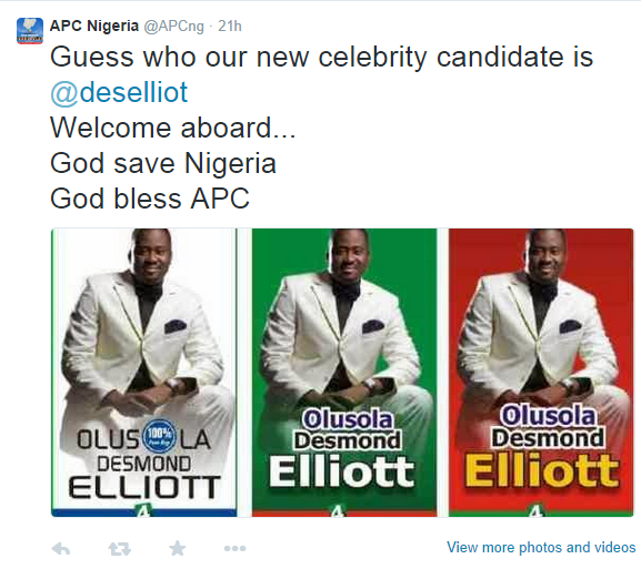 The party tweeted from their official handle saying: ‘Guess who our new celebrity candidate is? @deselliot welcome aboard… God save Nigeria God bless APC.’