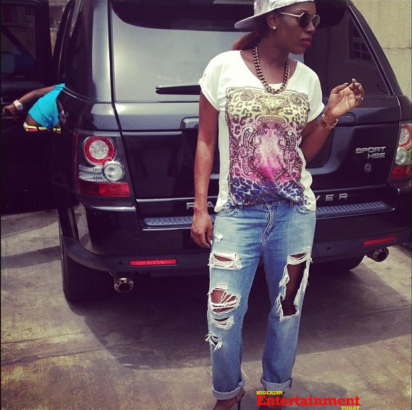 Mrs Idibia was sporting a urban-themed look – rocking a fitted backwards, low-neck white tee, ripped out jean trousers, wearing heels with a gold chain and wrist watch.