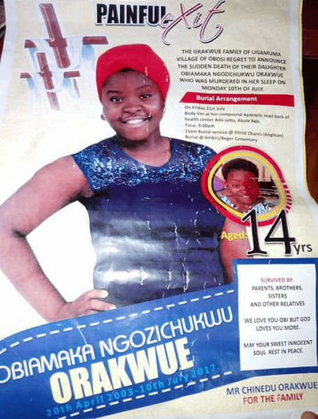 The life of 14-year-old Obiamaka Ngozichukwu Orakwue has been cut short by suspected ‘area boys’ who wouldn’t take ‘no’ for an answer to their romantic advances.