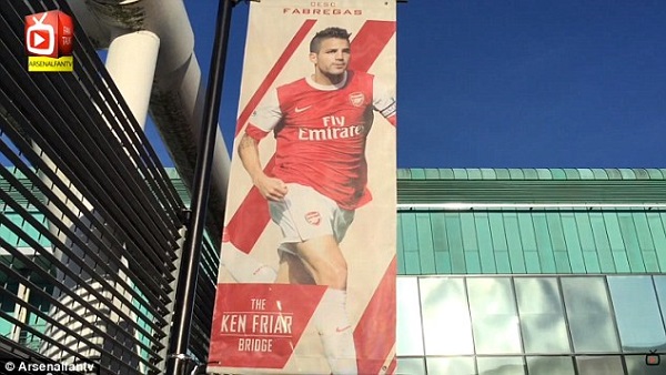 With Arsenal set to face Chelsea in the Premiership match billed for Sunday, April 26, 2015, fans of the North London side are demanding the removal of the banner which has the image of the former Arsenal captain, Cesc Fabregas on Ken Friar Bridge at the Emirates Stadium.