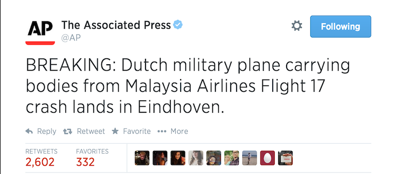 AP sent out the tweet informing the world that a Dutch military plane carrying bodies from the Malaysia Airlines Flight 17 (which was shot down at the Russia-Ukraine border on July 17, 2014) had landed Eindhoven, Netherlands but kind of sent out the message the wrong way (thanks to bad punctuation skills).