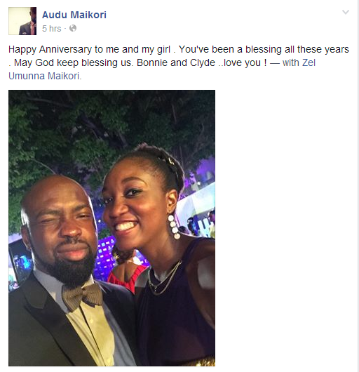 Chocolate City boss, Audu Maikori is today, February 9, 2015 celebrating his wedding anniversary with his pretty wife, Zel Umunna Maikori.