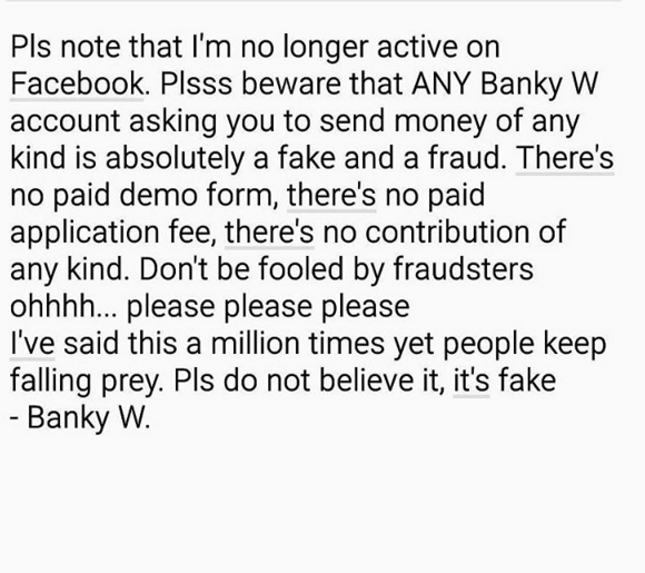 According to Banky W, ‘I am only on Instagram (@BankyWellington), twitter (@BankyW) and snap chat (@BankyWellington). I’m no longer on Facebook. Any FB account asking you for money for anything is completely fake and a fraud. Please ignore and report the account to them’.