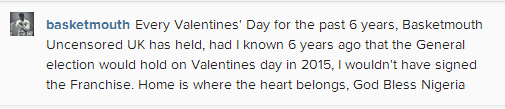 ‘Every Valentines’ Day for the past 6 years, Basketmouth Uncensored UK has held, had I known 6 years ago that the General election would hold on Valentines day in 2015, I wouldn’t have signed the Franchise. Home is where the heart belongs, God Bless Nigeria,’ he wrote.