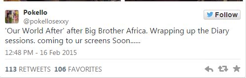 An excited Pokello, who apparently could not wait to share the good news with the general public, made the announcement via her Twitter account on Monday, February 16, 2015, accompanied with a collage photo of the diary session.