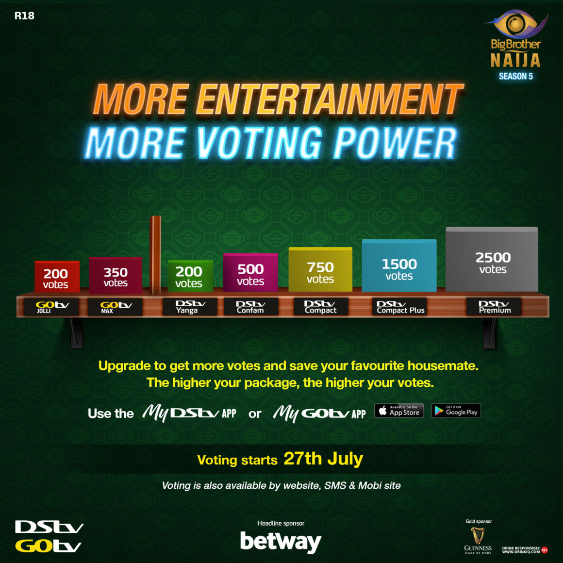 This season, Big Brother is ceding more power to the fans with the introduction of the tiered voting system which gives GOtv and DStv subscribers an edge and more votes to keep their favourite BBNaija housemates in the house. With your DStv and GOtv packages, you are entitled to more votes, and the higher your package, the higher your votes. DStv Premium customers will get 2,500 votes; Compact Plus will have 1,500 votes; Compact customers will get 750 votes while Confam and Yanga customers will get 500 and 200 votes respectively, For GOtv customers on Max, they get 350 votes and GOtv Jolli customers get 200 votes.