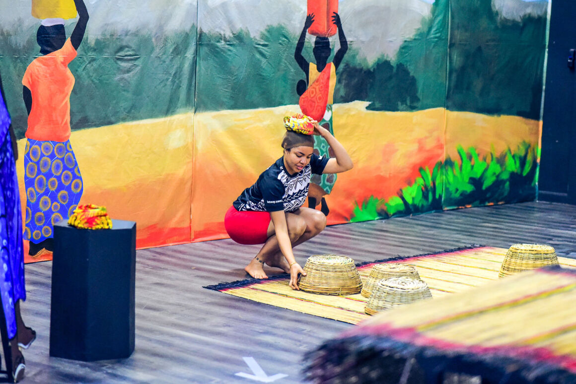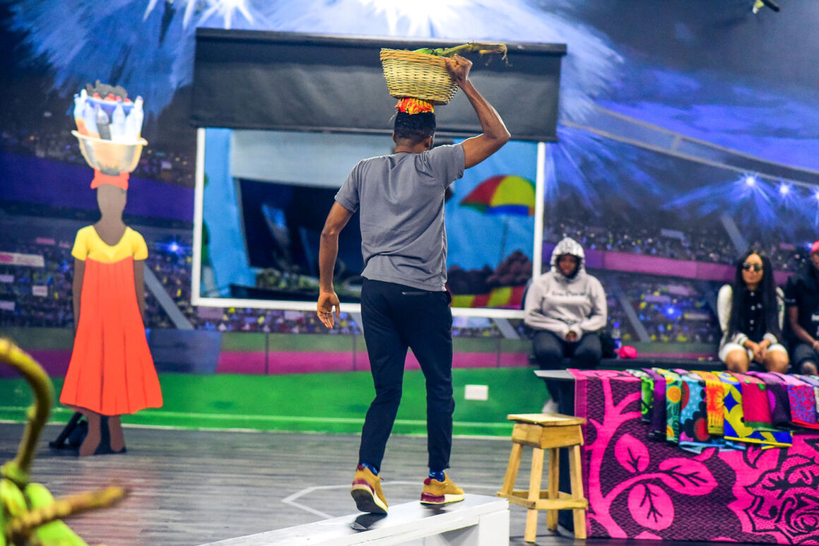 This week, the Betway arena was set up as a village market complete with stalls, a pond, a bridge, fruit trees, etc. The housemates were instructed to place a basket on their heads at the sound of the buzzer and proceed through the market before their allotted 3 minutes expired.