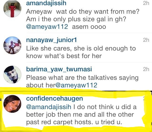 In an Instagram post seen on Ameyaw Debrah’s account, where he gave thumbs up to Amandah Jissish for her reaction to her critics over red carpet hosting, Confidence, who is still displeased with her performance on the red carpets, hit back at the plus sized celebrity.