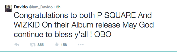 Davido tweeted today, saying: ‘Congratulations to both P SQUARE And WIZKID On their Album release May God continue to bless y’all OBO’.