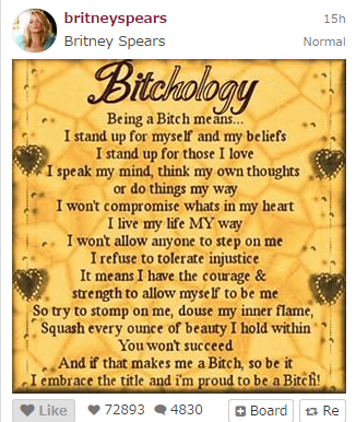 The ‘Toxic’ hitmaker shared a poem on Instagram, which is entitled ‘Bitchology’ and reads: ‘Being a bitch means…