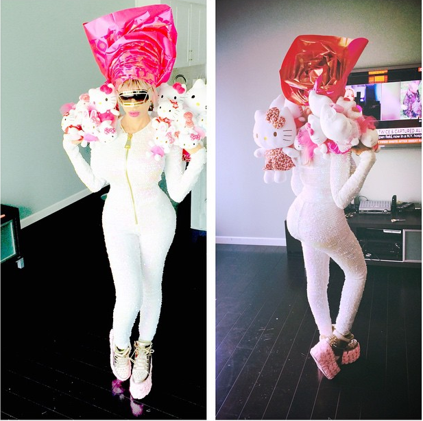 Dencia wore a figure hugging body suit adorned with Hello Kitty dolls, gold shades, platform heels and she put an African touch to her unique outfit by rocking a gele along with it.