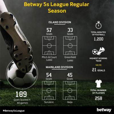After 5 weeks, 189 goals were scored in 60 games played across four locations., In the Island division, at Pitch and Court Lekki, 57 goals were recorded, while at Greenfield stadium, also in Lekki, 33 goals were scored as 6 teams battled it out for a place in the playoffs.