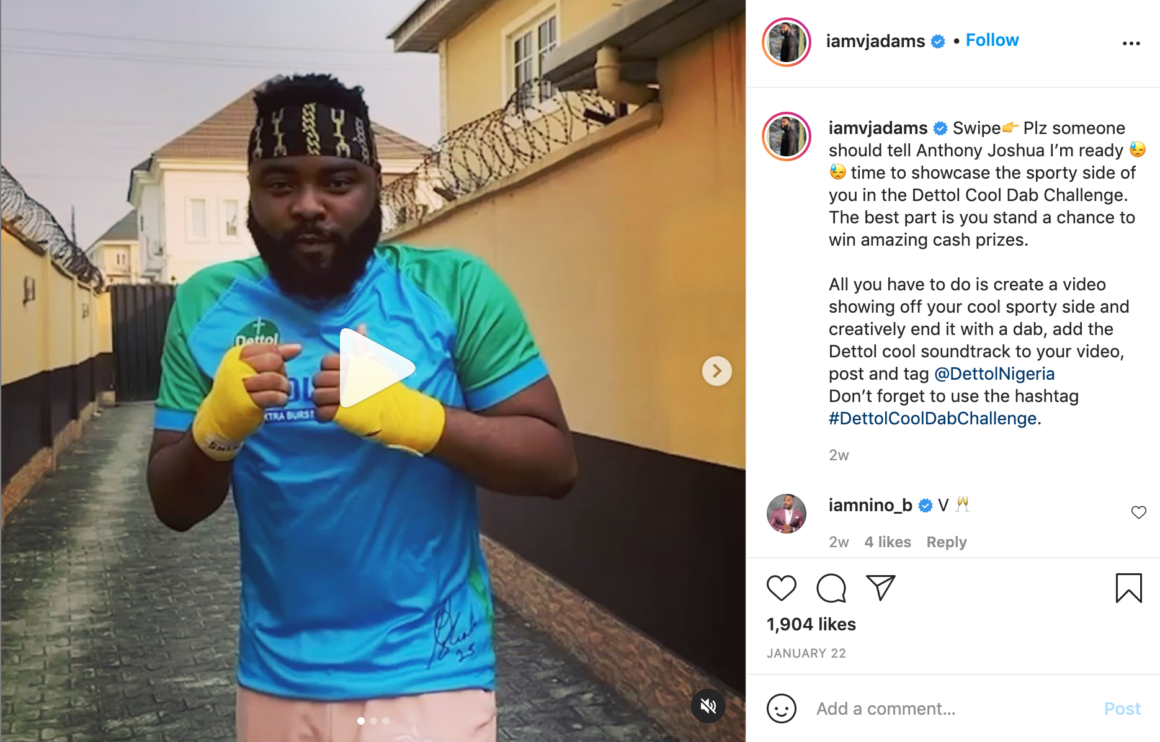 To participate, all you need to do is take a video of yourself showing off a cool physical activity and wrap it up with a dab; search and add the ‘Dettol Cool Soundtrack’ to your video. Then, post it with the #DettolCoolDabChallenge and tag @dettolnigeria and @ighalojude. The winning videos will be chosen based on creativity, engagements, and compliance with the terms and conditions.