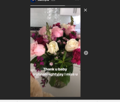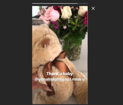 The 30-year-old mother of two took to her Instagram story to show off the gifts she received from her beau. She wrote: ‘Thank u baby “ybnalmightyjay I miss u.’