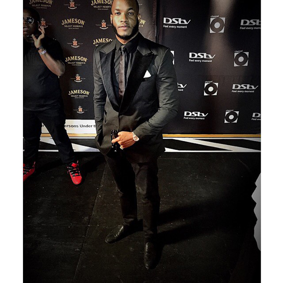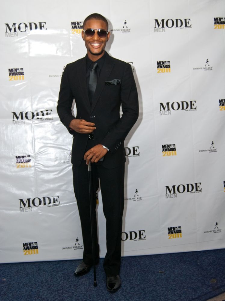 Praiz rocked a black suit that has a silk lapel on a black shirt and silk tie. He finished the look with black shoes and dark shades and we think he looks very good.