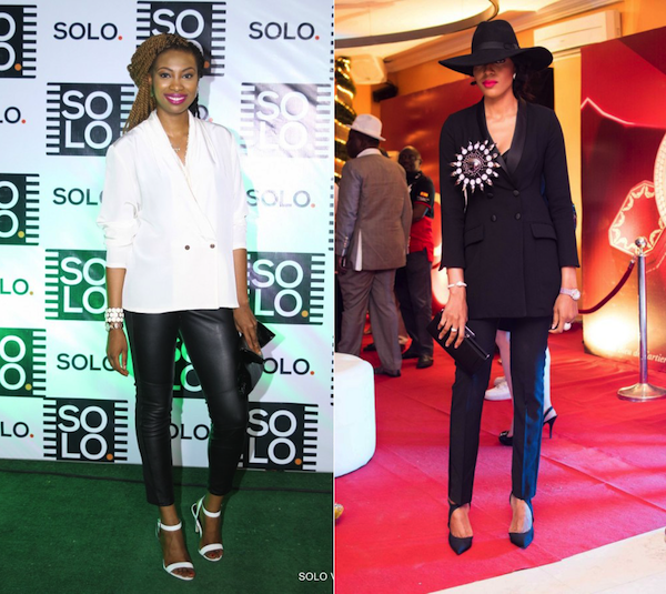 TV host, Bolanle wears a white single-breasted jacket on a black leather pant to the Solo Phone Nigeria launch while designer, Ene Maya Lawani stuns in her very feminine black double-breasted jacket on black pant and accesorised with a massive brooch and a hat which gave her the sexy cow girl look.