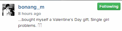With just 4 days to the 2015 Valentine day celebration, Bonang has bought herself a brand new Mercedes Benz CLA 45 AMG which is valued at over $49,000 (over N9M) and has shared pictures of the car with the caption: ‘Bought myself a Valentine’s Day gift. Single girl problems.’