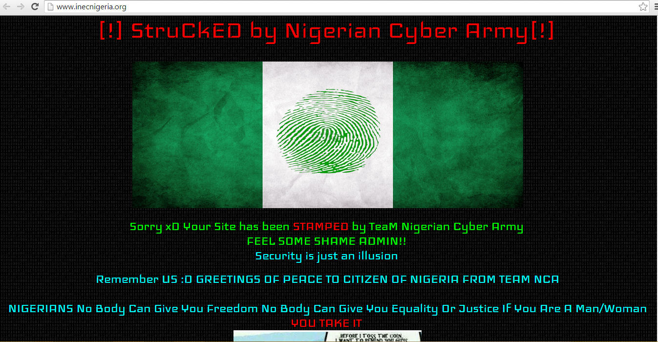 With the ongoing 2015 Presidential election holding nationwide today, the stakes are indeed high and we can tell you the official website (inecnigeria.org) of the Independent National Electoral Commission (INEC) has been hacked.