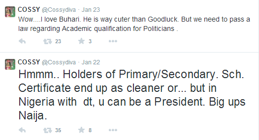 With the 2015 presidential elections gradually drawing closer, more celebrities continue to express their opinions and as odd as it is, Cossy has made her own views known.