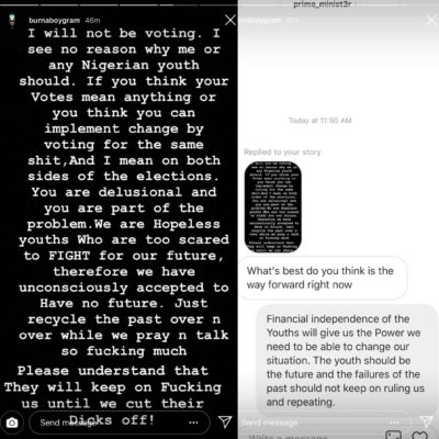Burna made this know via a post on his Instagram. The afro-dancehall star said he didn’t the need for him or any Nigerian youth to vote because votes mean nothing and will not implement anything.