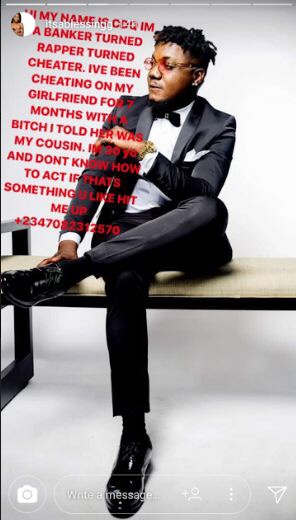 Nigerian rapper, CDQ, has been called out by his ex-girlfriend for cheating on her with a woman he claimed was his cousin.