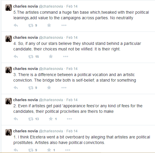 According to him, Etcetera went a bit overboard with his write up and it is not so wrong for entertainers to align with politicians during such periods.