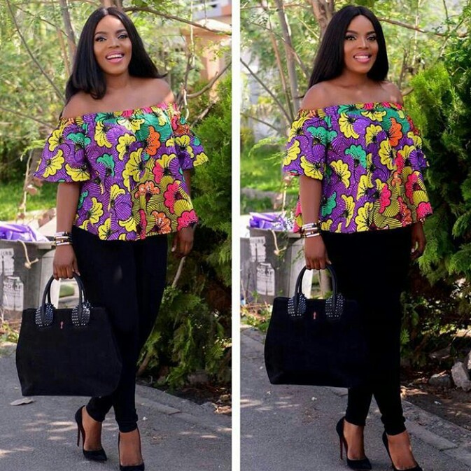 Nollywood actress, Empress Njamah, lights up her day with this lovely Ankara top and a black pants with a black tote handbag.