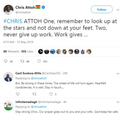 Sequel to the unfortunate event, Chris Attoh has taken to his twitter to share his first post since the murder that happened on Friday, May 11. He advised fans to never give up in whatever they find doing and they also should never look down on themselves but up in the sky at the stars
